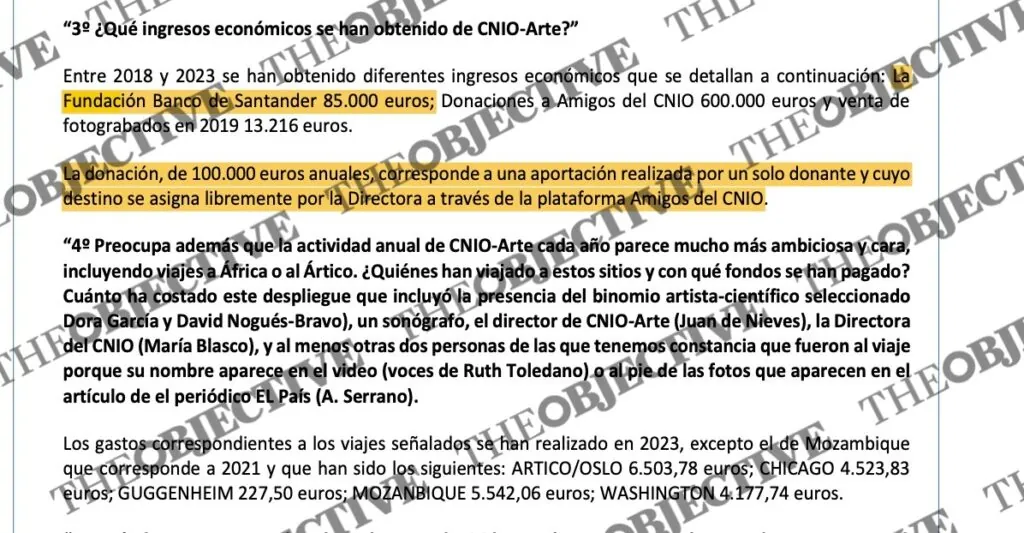 Sin embargo, el informe oficial firmado por Eva Ortega, secretaria general de Investigación del Ministerio de Ciencia, Innovación y Universidades, revela una cifra diferente sobre los ingresos de CNIO-Arte entre 2018 y 2023. Según este documento, los ingresos obtenidos son los siguientes: una donación de 85.000 euros por parte de la Fundación Banco de Santander, contribuciones a través de la plataforma Amigos del CNIO que suman 600.000 euros, y los 13.216 euros obtenidos por la venta de fotograbados en 2019. Además, se detalla que los 100.000 euros anuales mencionados corresponden a una aportación de un único donante, cuya contribución es asignada a discreción de la directora del programa a través de la plataforma Amigos del CNIO.