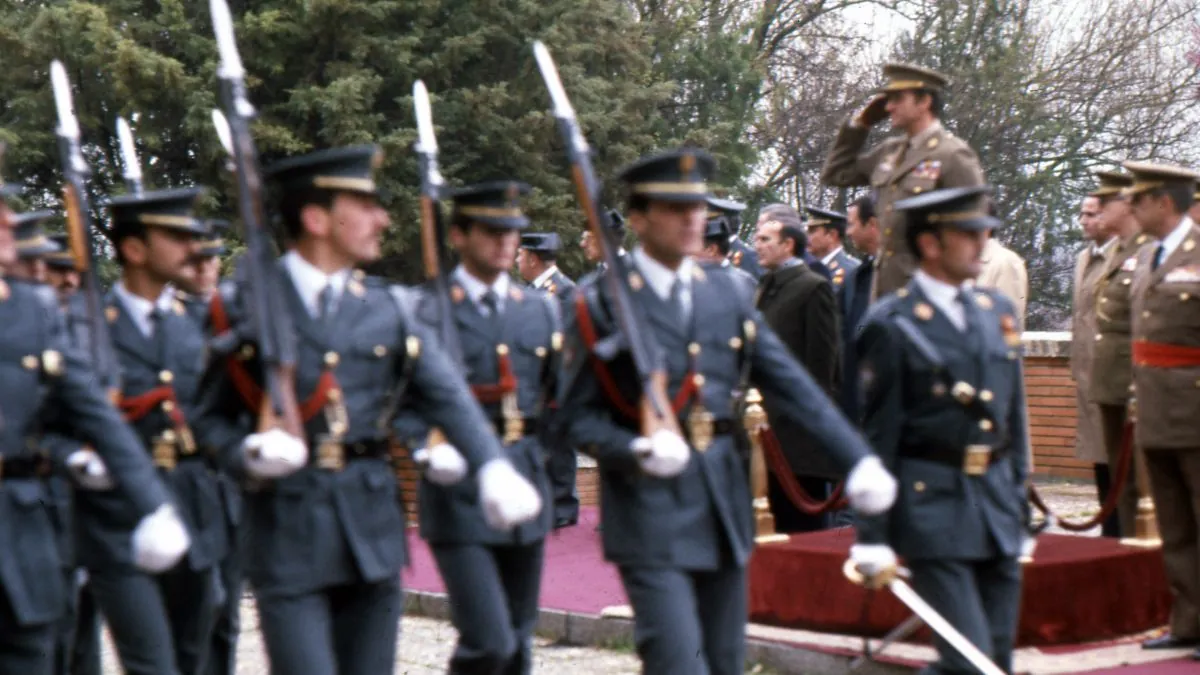 El rey Juan Carlos I pasando revista a las tropas durante un desfile similar al acto en el que casi atentan contra su vida. | Europa Press
