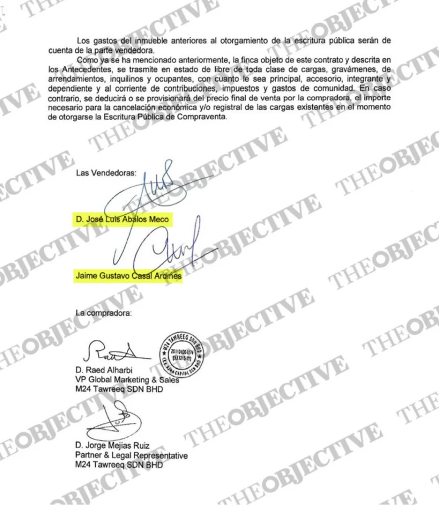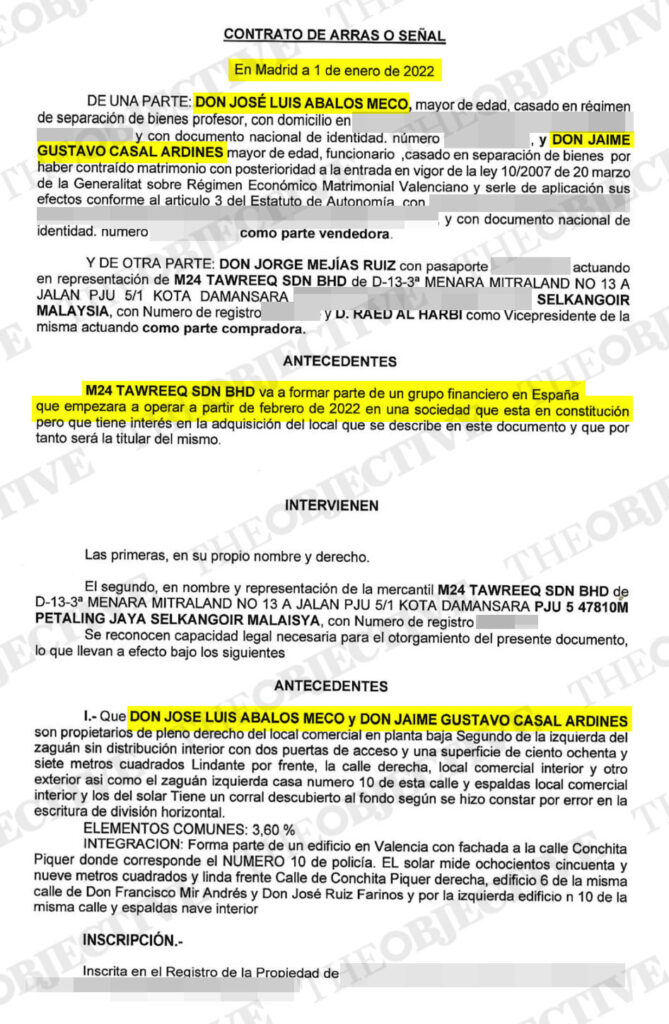 Las citadas fuentes revelan que fue Koldo García el que garantizó la viabilidad de la concesión de la licencia bancaria alegando: «Nosotros tenemos a nuestros funcionarios». A lo largo de tres meses de supuestas gestiones, Koldo transmitió al intermediario de la sociedad malaya: «Tenéis que comprar este local a cambio de la licencia». El contrato de arras se firmó el 1 de enero de 2022 entre los dos propietarios del local comercial de Valencia, José Luis Ábalos y Jaime Gustavo Casal Ardines, y los dos representantes de la empresa compradora malaya, Raed Alharbi, vicepresidente de marketing y ventas de M24 Tawreeq, y Jorge Mejías Ruiz, partner y representante legal.