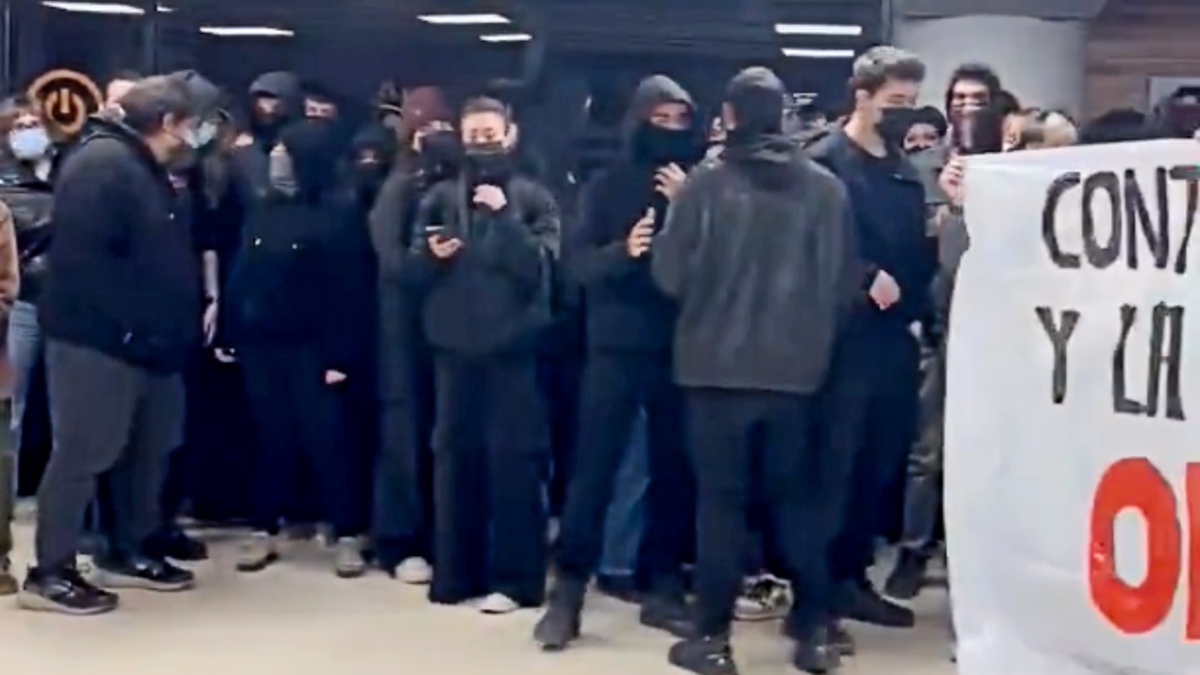 Desde media hora antes de que comenzara el acto, decenas de manifestantes con el rostro cubierto ya se encontraban en el auditorio sosteniendo una pancarta y coreando: «Fuera fascistas de la Universidad». Además, bloquearon la entrada, dificultando el paso de los asistentes, que esperaban en fila fuera del recinto.
