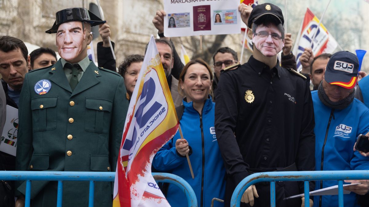 Durante la concentración, los sindicatos policiales han exhibido muñecos de agentes con los uniformes de Policía y Guardia Civil con las caretas de Pedro Sánchez y Carles Puigdemont. En paralelo, el ministro del Interior, Fernando Grande-Marlaska, ha negado durante el Pleno del Congreso que se vayan a ceder «el control de fronteras ni los flujos migratorios irregulares», limitando el acuerdo a una «delegación importante y muy relevante» en gestión migratoria.