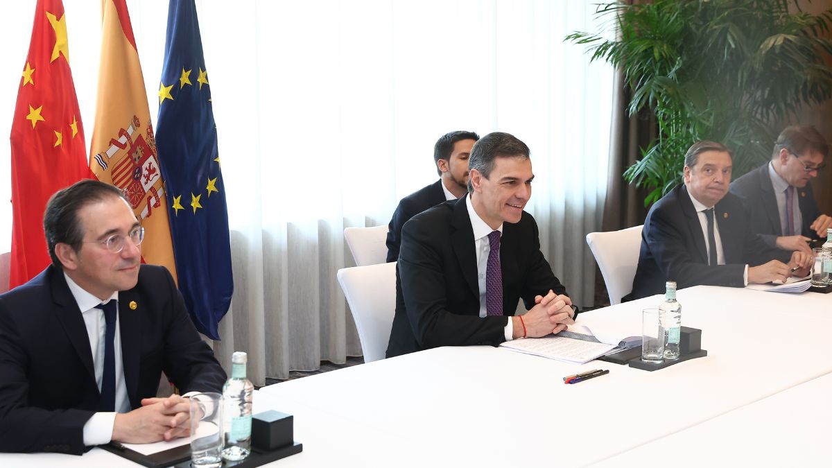 José Manuel Albares, Pedro Sánchez y Luis Planas durante su visita a China. | Europa Press