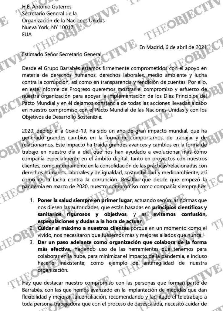 En la misiva de tres páginas, Barrabés asegura lo siguiente al jefe de la ONU: «Estimado señor secretario general, desde el Grupo Barrabés estamos firmemente comprometidos con el apoyo en materia de derechos humanos, derechos laborales, medio ambiente y lucha contra la corrupción, así como en transparencia y rendición de cuentas», reza el comunicado, que concluye asegurando que «respecto a lucha contra la corrupción destacan la implantación del Código Ético del Grupo Barrabés».