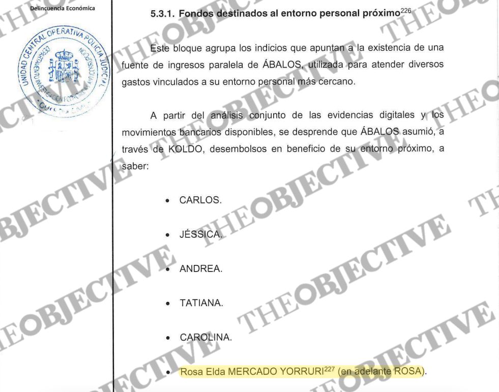 Un nuevo personaje aflora en la trama Koldo: Rosa Elda Mercado Yorruri. Fue la empleada del hogar de José Luis Ábalos durante su estancia en la residencia oficial como ministro en la calle Balbina Valverde de Madrid. Según ha podido saber THE OBJECTIVE, la mano derecha de Ábalos, Koldo García, realizaba pagos en negro a Rosa para comprar su silencio con lo que acontecía en el círculo estrecho del ministro, pero también en calidad de «topo», ya que era utilizada para comunicarle al asesor todas las averiguaciones y sospechas que tenía en aquel momento la esposa del ministro, Carolina Perles. De hecho, ella fue la trabajadora a quien Koldo le dijo que «todo lo que pasara en la casa lo tenía que saber él», según desveló la propia Perles en una entrevista exclusiva a este diario.