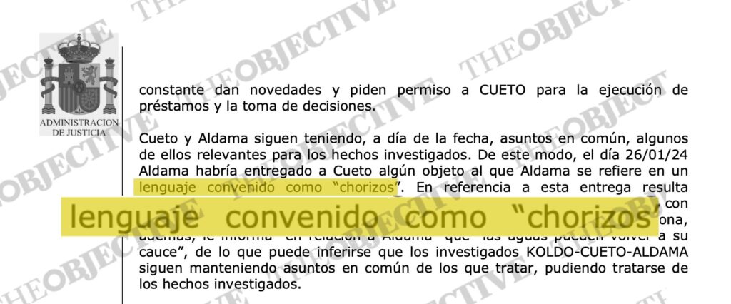 En los albores de aquella investigación aparecían reflejados detalles que ahora, un año y medio después, siguen haciendo referencia a la presunta operativa de la trama para evitar hablar abiertamente de dinero. Esa jerga ha sido claramente identificada por la UCO como un «lenguaje convenido». En el caso de Aldama, en ese primer informe se capta una conversación de 2023 entre uno de los hombres clave del caso mascarillas, el empresario Cueto, con su socio Víctor de Aldama. Hablan de ver cuántos «chorizos me traen». Los investigadores sospechan que estaban hablando de dinero en negro, de billetes que les iban a entregar para repartir procedentes de algún pago previo por sus gestiones.