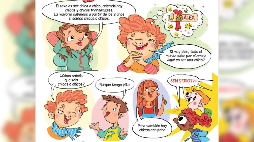 La guía, que tiene formato de cómic para hacerla más atractiva par a los niños, consta de 28 páginas. Se muestra a niños desnudos, a una niña con los pechos mutilados y a muchos de ellos compartiendo consignas transgeneristas. «Todo el mundo se está zambullendo en un proceso de sexuación y tiene características de los dos sexos. Nos vamos convirtiendo en mujeres y hombres, combinando características femeninas y masculinas», explica un personaje a los niños vascos. También se explica mediante ilustraciones el proceso de cambio de sexo, romantizándolo.
