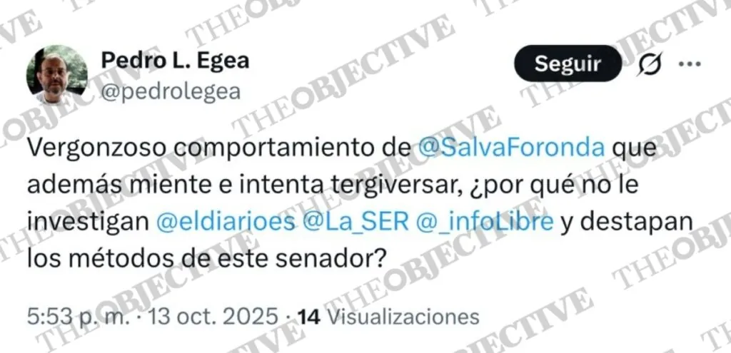 «Vergonzoso comportamiento de Salvador de Foronda, que además miente e intenta tergiversar, ¿por qué no le investigan @eldiario.es, @La_SER @_infolibre y destapan los métodos de este senador?», escribió Egea. El tesorero de Bancal de Rosas se mostró especialmente crítico con el senador del PP por la intervención que realizó durante la comparecencia de Chicano en la comisión de investigación del caso Koldo.