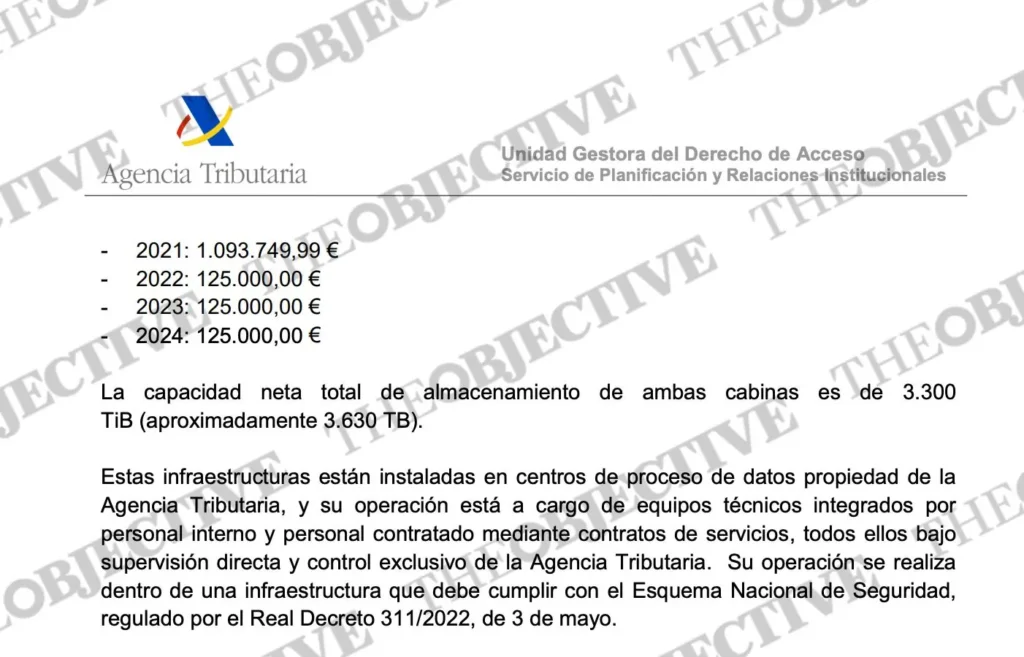 «La Agencia Tributaria dispone de dos cabinas de almacenamiento del modelo Huawei OceanStor Dorado 8000, adquiridas en 2021 conforme al Acuerdo Marco 13/2018 del Sistema Estatal de Contratación Centralizada». Según admite Hacienda a través de su Unidad Gestora del Derecho de Acceso de Transparencia, el importe total del contrato ascendió a 1.468.749,99 euros (IVA incluido).
