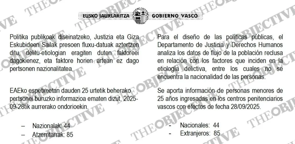 En el País Vasco los presos extranjeros duplican a los nacionales entre los menores de 25 años. En la actualidad, hay 129 delincuentes jóvenes en las cárceles vascas, de los cuales 44 nacieron en España o han sido nacionalizados, y 85 (el 65,9%) provienen de otro país. Así se desprende de una respuesta de la Consejería de Justicia y Derechos Humanos del Gobierno vasco al Grupo Parlamentario Popular a la que ha tenido acceso en exclusiva THE OBJECTIVE.