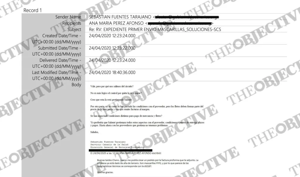 La situación no pasó inadvertida en los despachos del Servicio Canario de Salud donde se gestionaban los contratos sanitarios en la pandemia. La Unidad Central Operativa, por ejemplo, incorpora a su investigación un e-mail de Sebastián Fuentes Tarajano, de la Dirección General de Recursos Económicos, en el que, tras comprobar los términos del contrato, se pregunta: «Por otra parte, no sé cómo se han pactado las condiciones con el proveedor, pero los fletes deben formar parte del precio de la mercancía y veo que remite facturas al margen. ¿Se han negociado condiciones distintas para pago de mercancías y fletes?».