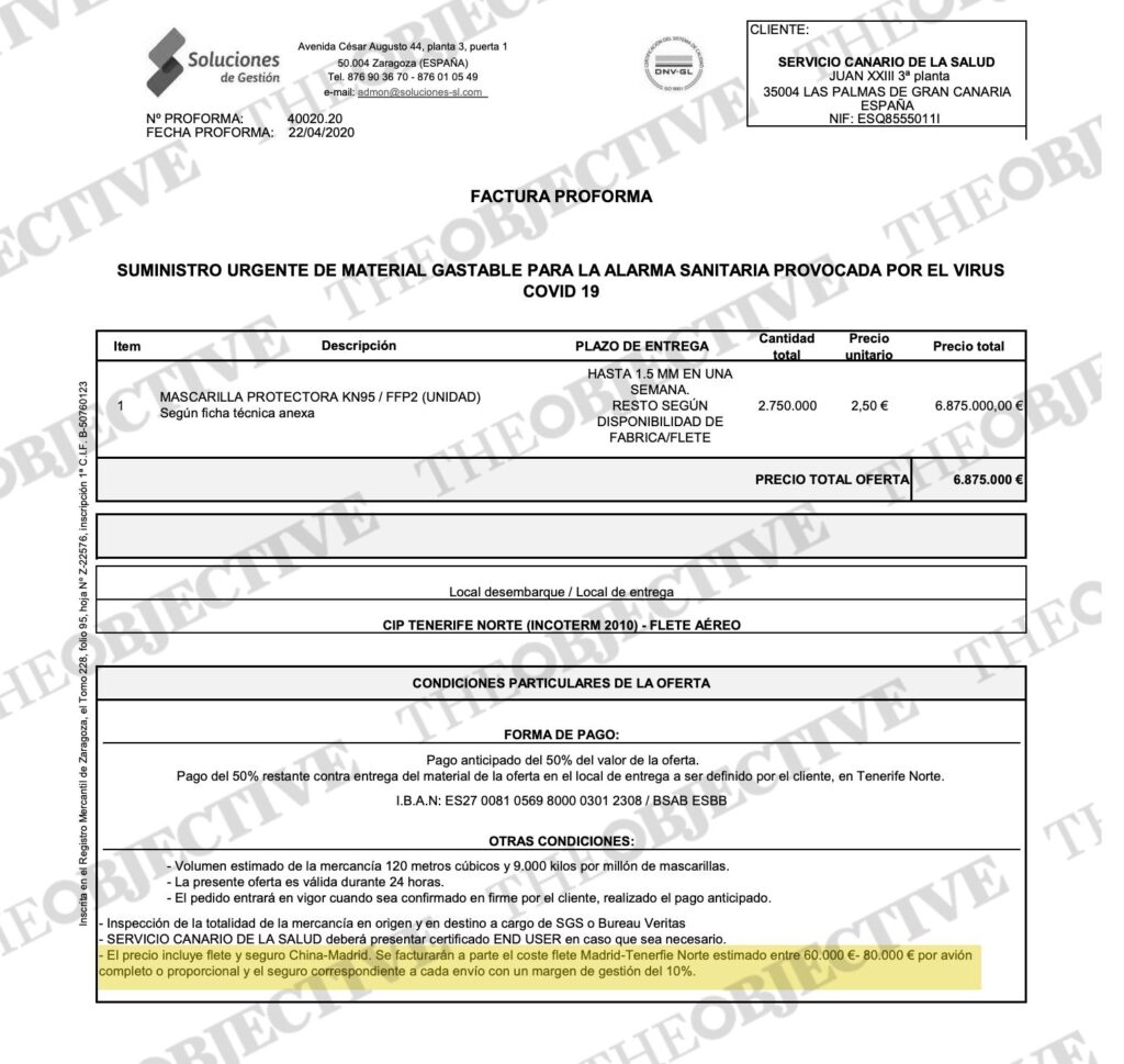 La factura proforma provocó un cambio fundamental en el contrato: en ella se estipulaba, a diferencia de lo que se había pactado previamente, que el flete de las mascarillas entre Madrid y Tenerife-Norte «no estaba incluido». El de China a España sí, pero los 60.000-80.000 euros por cada avión nacional para llevar el material a las islas debían pagarlos el Gobierno de Torres. Las mascarillas, a 2,5 euros la unidad, ya no solo eran algunas de las más caras que habían encontrado en el mercado en ese momento, sino que además tampoco incluían el envío. La sanidad canaria no estaba negociando con esas condiciones, aunque como reconocería Torres meses después, este contrato tenía un componente de «excepcionalidad».