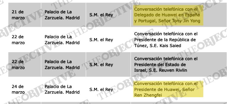 Así ocurrió. No fue una llamada telefónica con el Rey la que consiguió Huawei, sino dos, tal y como figura en el registro completo de actividades en ese 2020 que ofrece Zarzuela a través de su portal de Transparecia. La primera tuvo lugar el 21 de marzo y el interlocutor fue el entonces CEO de Huawei en España, Tony Jin Yong. El hombre que ‘fichó’ a Zapatero a través del empresario Fangyong Du —al que el CNI vincula al espionaje chino— y meses después a sus hijas y al comisionista Víctor de Aldama. La segunda llamada de Huawei se produjo el 24 de marzo y el interlocutor fue Ren Zhengfei, fundador y presidente mundial de la compañía.