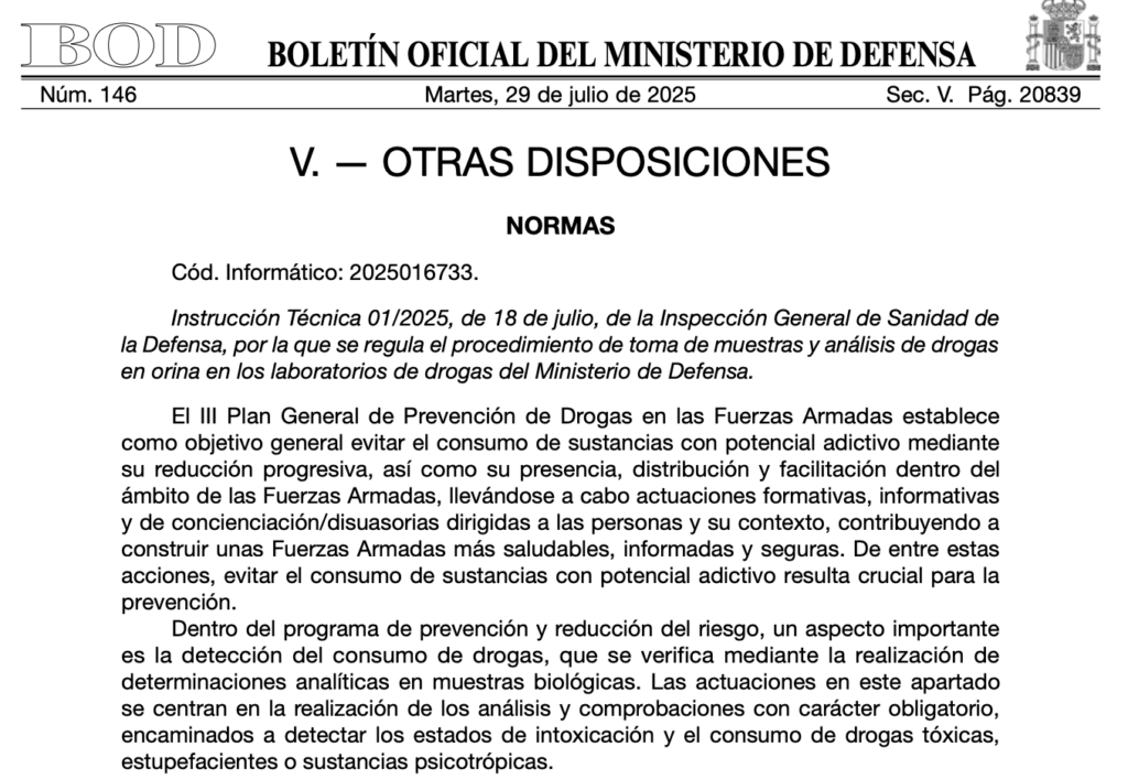«Deberá existir, al menos, un testigo encargado de actuar como supervisor del procedimiento. Deberá estar presente durante la emisión de la orina, asegurándose la vista de la salida de la muestra del cuerpo de la persona que realiza la micción, sin ninguna obstrucción, teniendo en cuenta que siempre deberá ser del mismo sexo que el interesado. Para asegurar una clara y no obstruida visión del paso de la muestra, el testigo instruirá a la persona que debe realizar la micción sobre como retirarse o ajustar la ropa que pueda dificultar la visión de forma nítida de la muestra», indica Defensa en la citada instrucción técnica a la que ha tenido acceso THE OBJECTIVE.