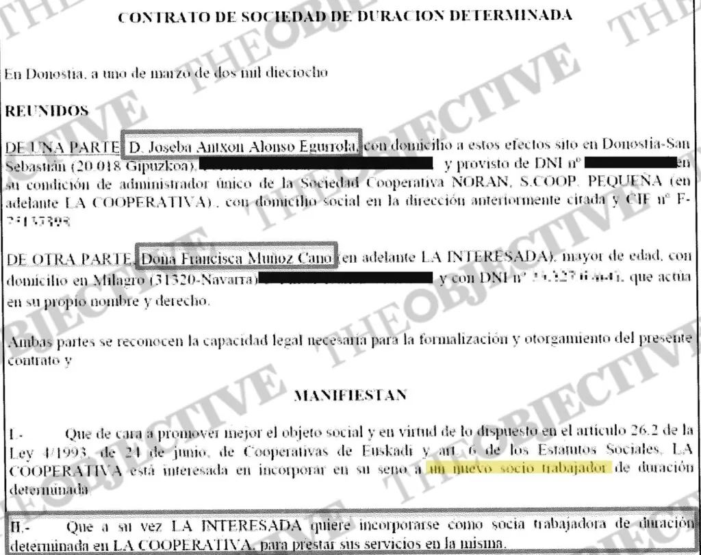 Muñoz firmó en ese contrato que se comprometía con «todos los derechos y deberes que le corresponden, a tenor de lo dispuesto tanto en los Estatutos Sociales» de la cooperativa. «La interesada se compromete formalmente a adquirir el conocimiento necesario de los Estatutos Sociales y Reglamento de Régimen Interno Cooperativo y de los acuerdos adoptados por los órganos sociales de la cooperativa, por lo que recibe que este acto una copia de todos ellos». Una situación que podría complicarle seriamente el futuro legal.