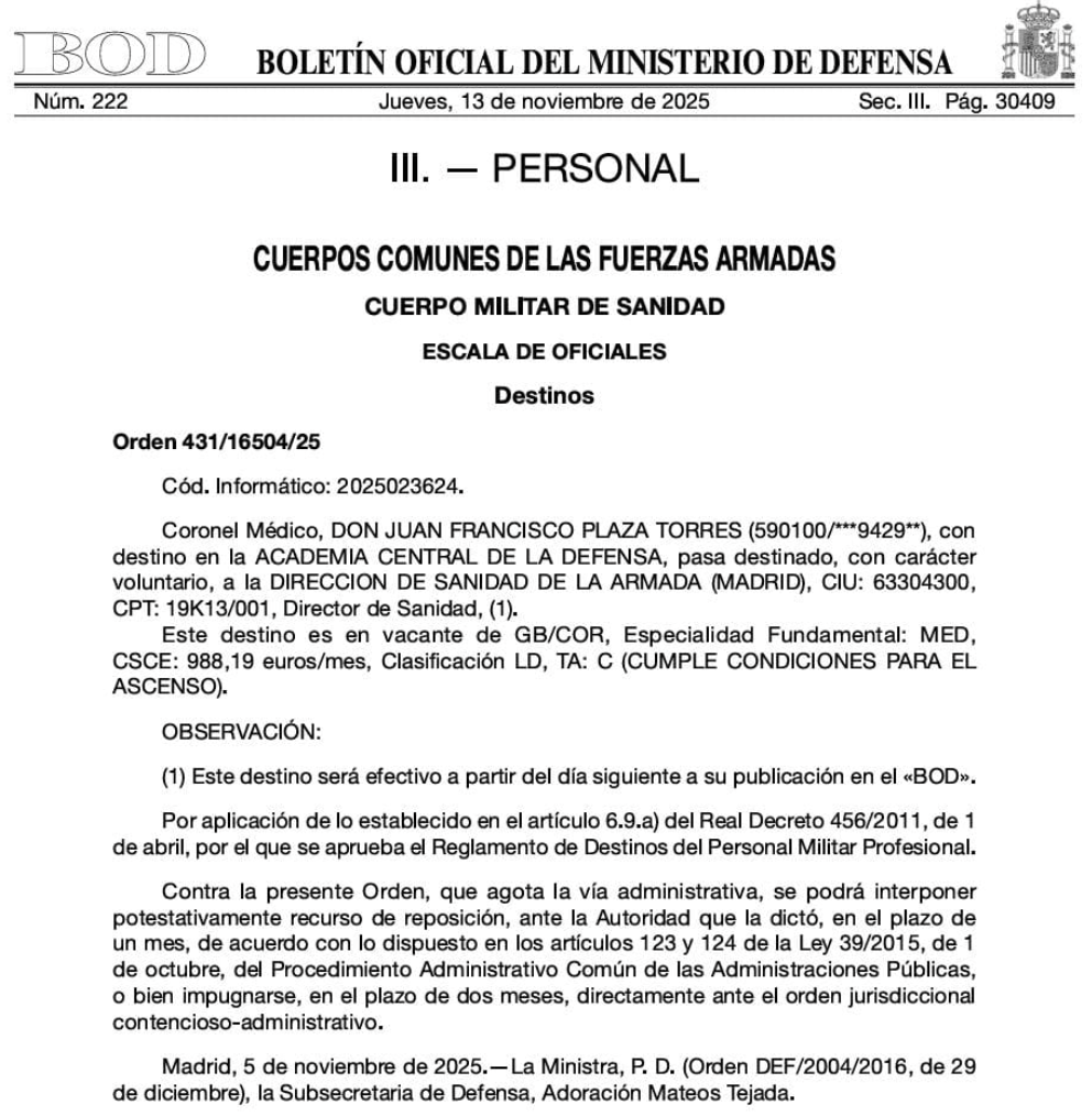 El elegido para ocupar esta plaza con carácter inmediato es el coronel médico Juan Plaza, destinado hasta ahora en la Academia Central de la Defensa, puesto en el que le sustituye el coronel veterinario Alberto Zamora. Los nombramientos de Plaza y Zamora se firmaron el 5 de noviembre y aparecieron en el Boletín Oficial de Defensa (BOD) el pasado 13 de noviembre. Con la primera de las decisiones, Robles envía el mensaje de que no se plantea subsanar la inferioridad en la que se encuentra la Armada al no contar con un general médico en su cuartel general, a juicio de las citadas fuentes.