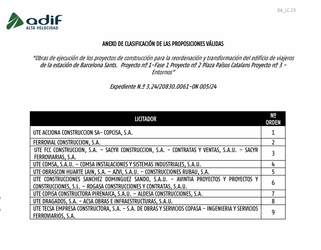 El 5 de noviembre de 2024 Acciona logró hacerse con un contrato de obra pública ambicionado por las grandes constructoras nacionales: la transformación de la estación de Barcelona Sants, una de esas obras icónicas que aporta gran visibilidad a la constructora que se la lleva. En este caso fue la firma de los Entrecanales la que logró que la mesa les otorgase la primera posición como mejor oferta en calidad-precio. No era la más barata; las otras seis aspirantes presentaron importes menores.