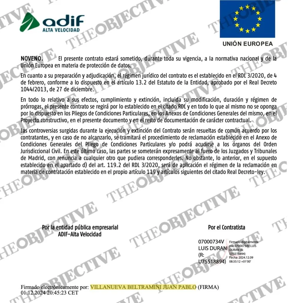 El contrato lo firmó como director general de ADIF Alta Velocidad Juan Pablo Villanueva, cargo de confianza de la expresidenta Isabel Pardo de Vera durante su mandato y considerado una de sus manos derechas en el ente gestor ferroviario. En marzo de este año fue nombrado director general de Negocio de ADIF, pero solo cuatro meses después fue cesado, coincidiendo con la imputación de Pardo de Vera.