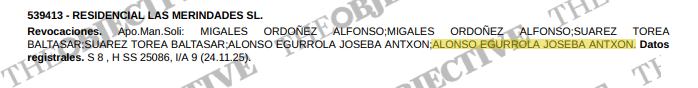 El pasado 4 de diciembre, el Boletín Oficial del Registro Mercantil dejaba constancia de que Antxon Alonso dejaba de ser administrador mancomunado de la sociedad Residencial Las Merindades S.L. Una firma de compraventa dedicada al mercado inmobiliario en la que tenía a otros dos socios, que también han renunciado a sus cargos.