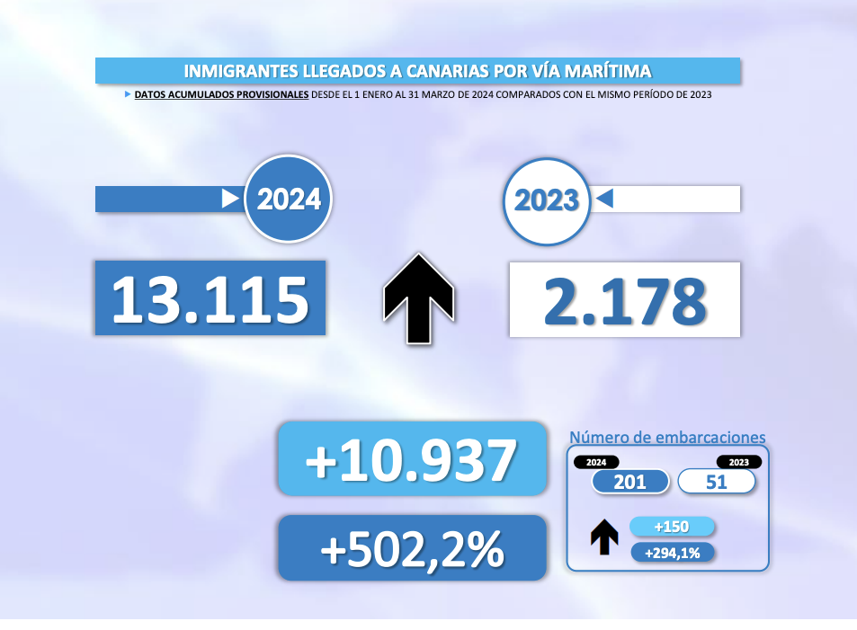 La situación entonces era prácticamente desesperada para las autoridades canarias. A fecha de 31 de marzo de 2024, según el balance oficial del registro de inmigración del Ministerio del Interior que ha podido consultar THE OBJECTIVE, habían llegado a Canarias por vía marítima un total de 13.115 personas, un incremento del 502% respecto a las cifras del año anterior. En cuanto al número de pateras, el aumento fue cercano al 300%, pasando de 51 a 201 respecto al anterior ejercicio.