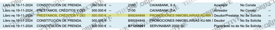 El 15 de noviembre de 2024, justo una semana después de que el caso escalase al Supremo, los libros de registro reflejan que la empresa Promociones Inmobiliarias Ku-Ma hizo un préstamo —y constitución de prenda— por valor de 300.000 euros a Servinabar, la empresa de Alonso Egurola y Cerdán.