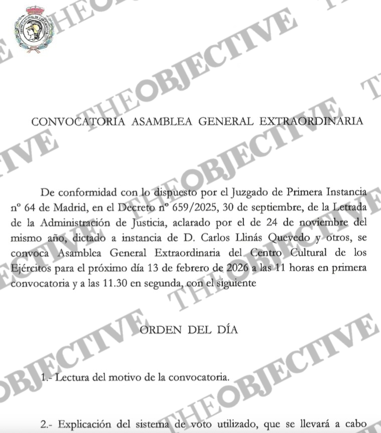 El Casino Militar de Madrid ha convocado para el próximo 13 de febrero una asamblea general extraordinaria en la que se votará la destitución de la actual dirección dirigida por Carlos Valverde y el nombramiento de una gestora que llevará las riendas del conocido como Centro Cultural de los Ejércitos hasta la celebración de unas nuevas elecciones internas, según se indica en el texto de la convocatoria a la que ha tenido acceso THE OBJECTIVE.