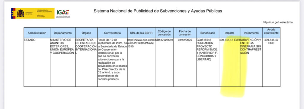 - Proyecto Reformismo 21 (antigua Fundación Concordia y Libertad), vinculada al PP, recibió 499.548 euros.