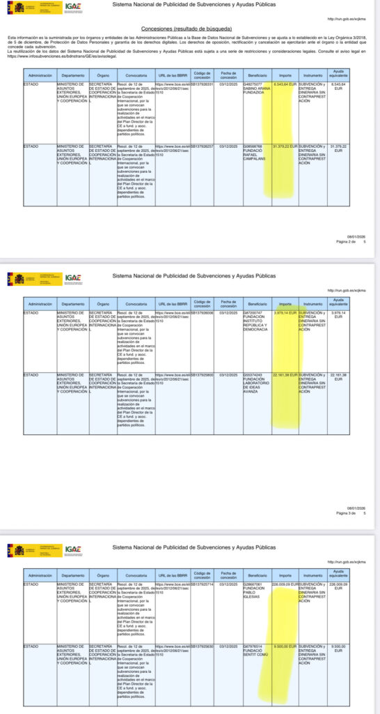 Las cantidades que reciben para esto son llamativamente altas y periódicas. Año tras año se produce un desembolso de 800.000 euros que parece repartirse entre las fundaciones con un criterio de representatividad de los partidos a los que pertenecen. Son 3.100.000 euros desde 2022 que parecen dedicarse a cooperación internacional o a su extensión y relaciones culturales, sociales o económicas con entes de otros países. Todo esto dicho si queremos pensar bien, pues es una cuestión de fe.