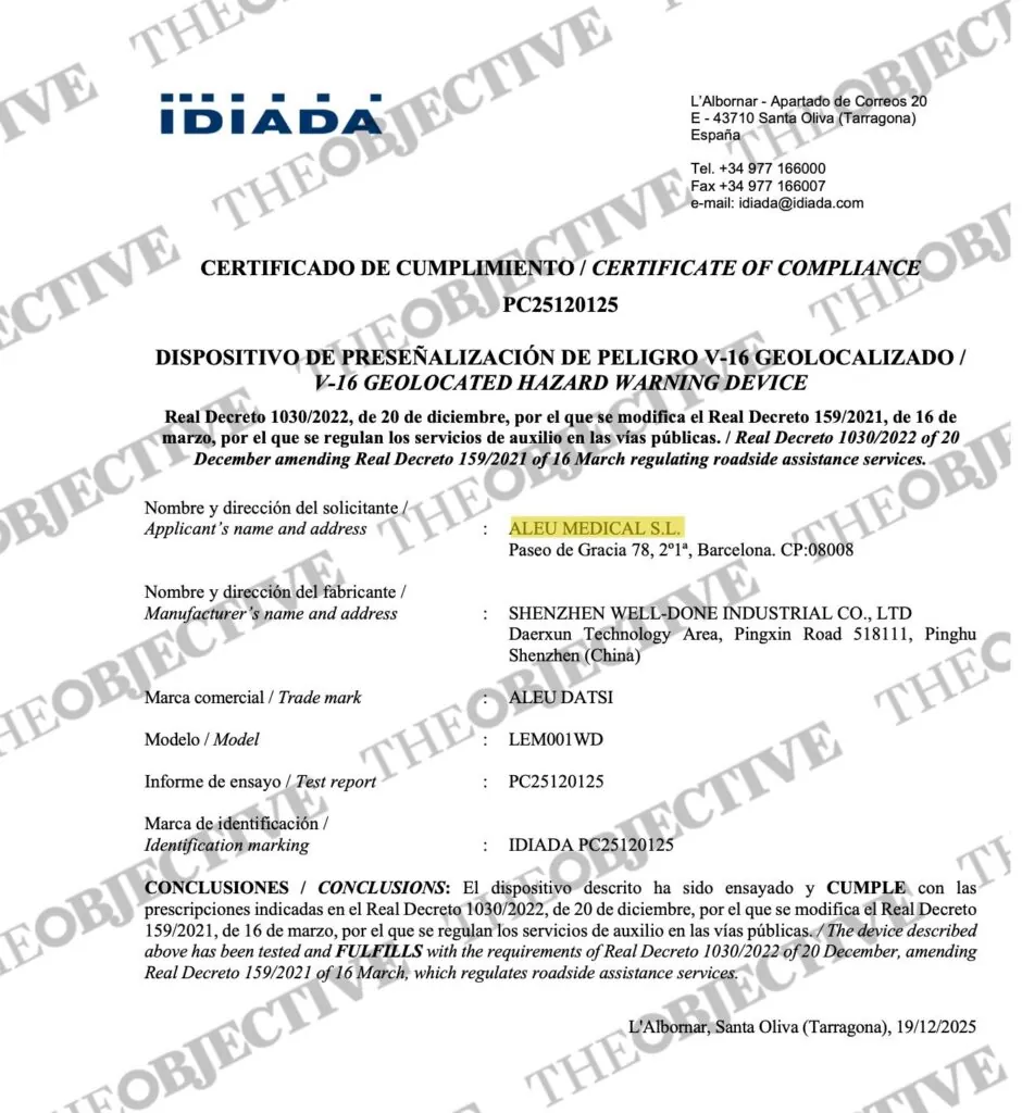 El pasado diciembre, la DGT tramitó in extremis la homologación de las balizas de Aleu, fabricadas en Shenzhen (China). Lo hizo en los últimos diez días del año, a pesar de que ya estaban a la venta desde mucho antes. De hecho, el certificado de cumplimiento expedido por un laboratorio privado, que concluye que las balizas de Aleu cumplen lo especificado por la DGT, tiene fecha de 19 de diciembre de 2025.