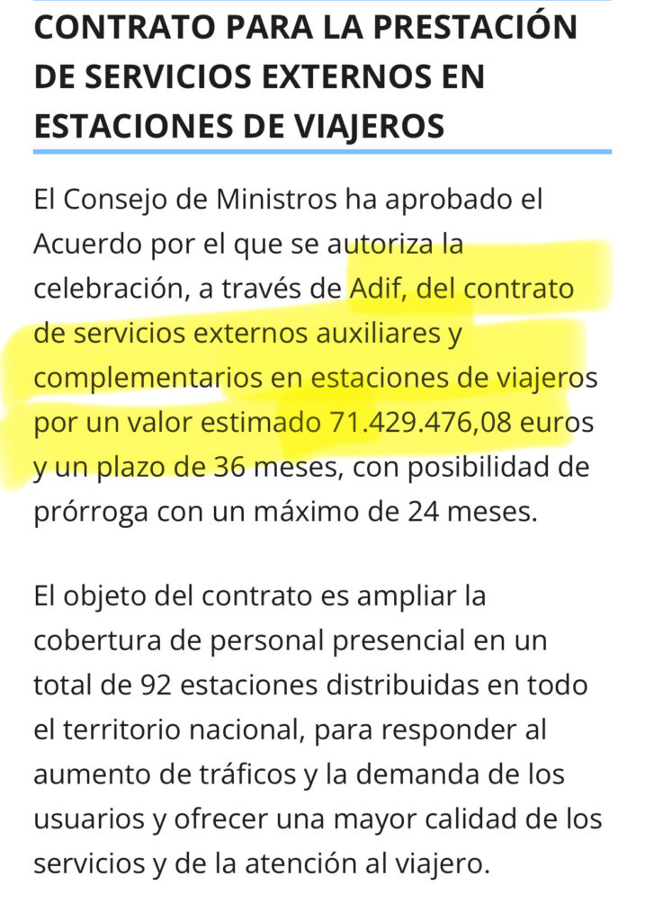 –Estaciones de viajeros. Adif tiene autorización del Consejo de Ministros para celebrar un contrato para los servicios externos auxiliares y complementarios por valor de 71.429.476 euros. Se amplía el personal presencial para responder al aumento de usuarios, supuestamente.