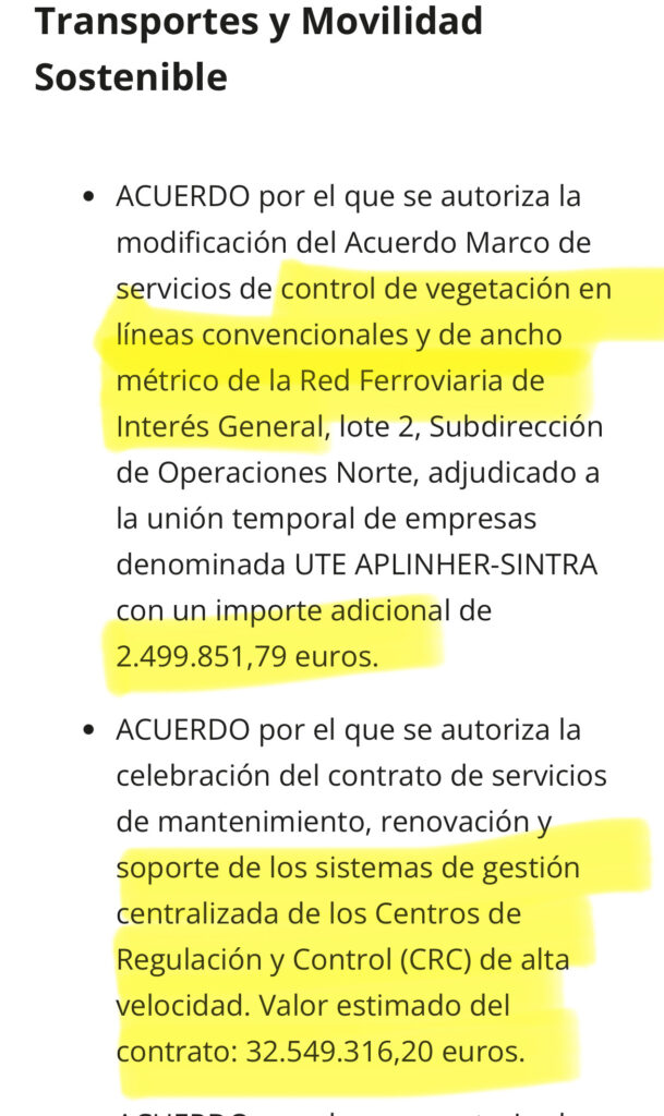 –Transportes. El Gobierno decidió ayer gastar más de 32,5 millones de euros en un contrato de mantenimiento y soporte de los Centros de Regulación y Control de la alta velocidad. Además, también nos gastaremos 2,5 millones de euros en el control de la vegetación en las líneas convencionales.