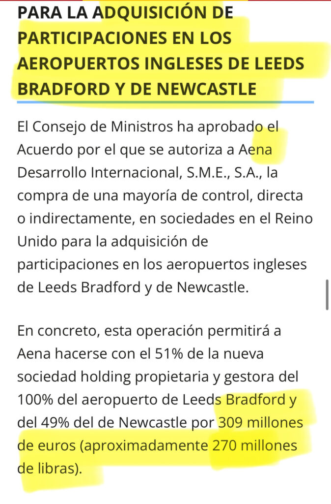 –Adquisición de participación en los aeropuertos ingleses de Leeds, Bradford y Newcastle. El Consejo de Ministros autoriza la compra, por valor de 309 millones de euros, de participaciones en la gestión de estos aeropuertos ingleses. ¿Por y para qué?