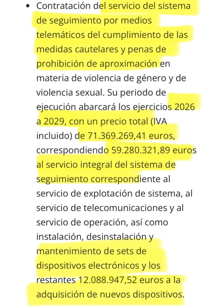 –Ministerio de Hacienda. Contrato del sistema de seguimiento telemático de penas. Hablamos de las pulseras y de toda la sistemática de seguimiento telemático que implica la violencia de género. La cantidad que se aprueba con este contrato es de 71.369.269 euros, de los que casi 60 millones de euros van destinados al sistema de seguimiento, telecomunicaciones y mantenimiento. Los 12 millones restantes van para adquirir nuevos dispositivos. ¿Por qué se compran nuevos dispositivos si, según la ministra de Igualdad, todo funcionaba perfectamente?