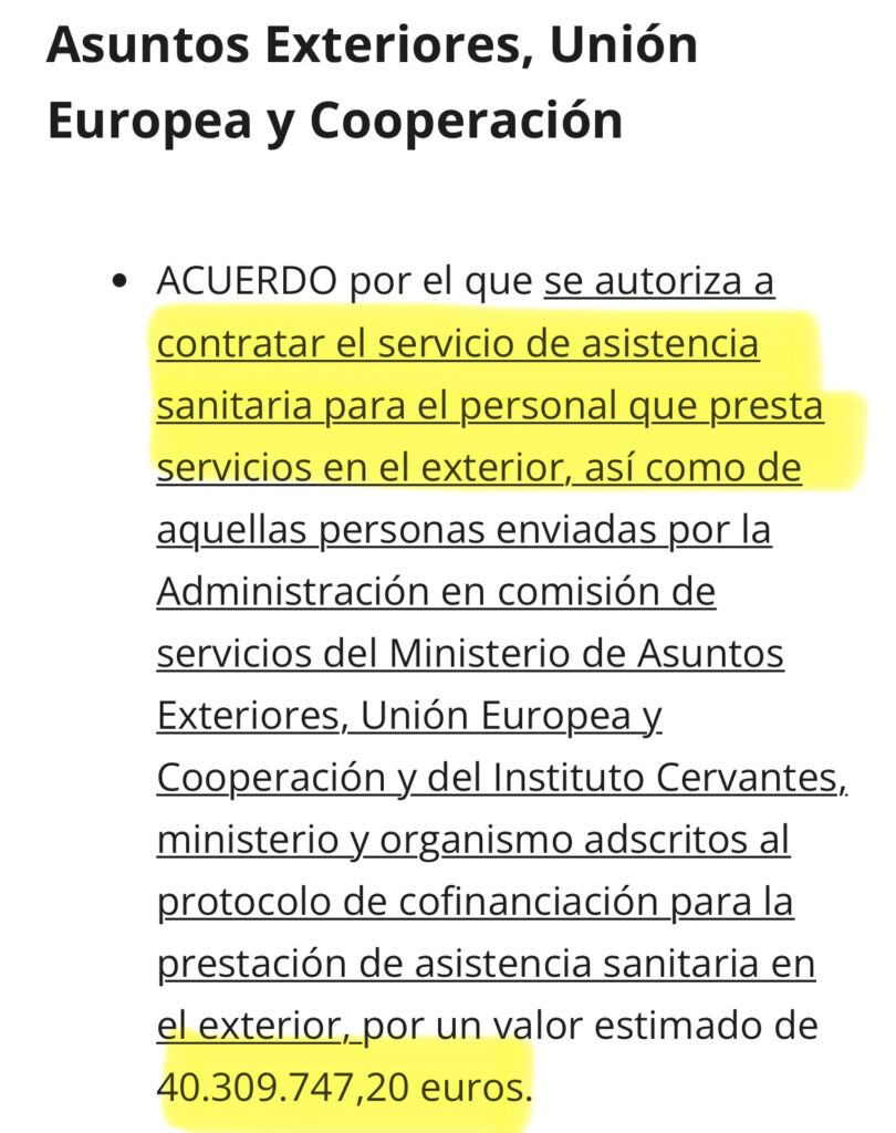–Asistencia sanitaria de nuestro personal diplomático y personal en el exterior. La atención sanitaria de este personal nos va a costar la friolera de 4.309.747 euros.