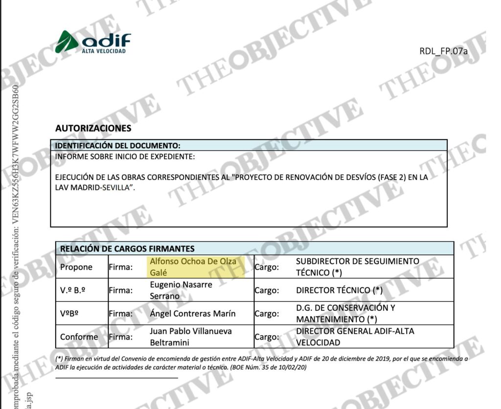 La firma de Ochoa de Olza aparece en los pliegos y en los informes del expediente de las obras correspondientes al «proyecto de renovación de desvíos en la línea de alta velocidad Madrid-Sevilla». ADIF encargó los trabajos en dos fases con el fin de actualizar los aparatos (así se denominan técnicamente) que ayudan a guiar a los trenes hacia bifurcaciones y otras vías aledañas. Precisamente, uno de los elementos de la vía que ahora se han convertido en principal interés de los investigadores sobre el terreno en Adamuz, donde el accidente ferroviario ha dejado un balance momentáneo de 42 fallecidos.