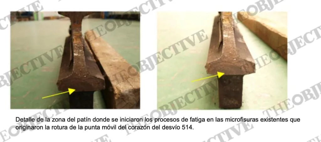 Según la conclusión de los investigadores de aquel suceso, «como causa directa del accidente se determina que se produjo por fallo de la infraestructura, debido a la rotura […] por plano transversal iniciado en la zona del patín, en la cual las microfisuras internas [debidas a los procesos de fabricación] han progresado por mecanismos de fatiga al producirse acumulación de tensiones en dichos puntos, debidos a los esfuerzos soportados por la estructura conjunta formada por el carril, sujeciones, traviesas, balasto y elementos móviles [punta del corazón del cruzamiento] al paso de las circulaciones soportadas». De hecho, se aportan fotografías que muestran la presencia de óxido en el centro de la pieza.