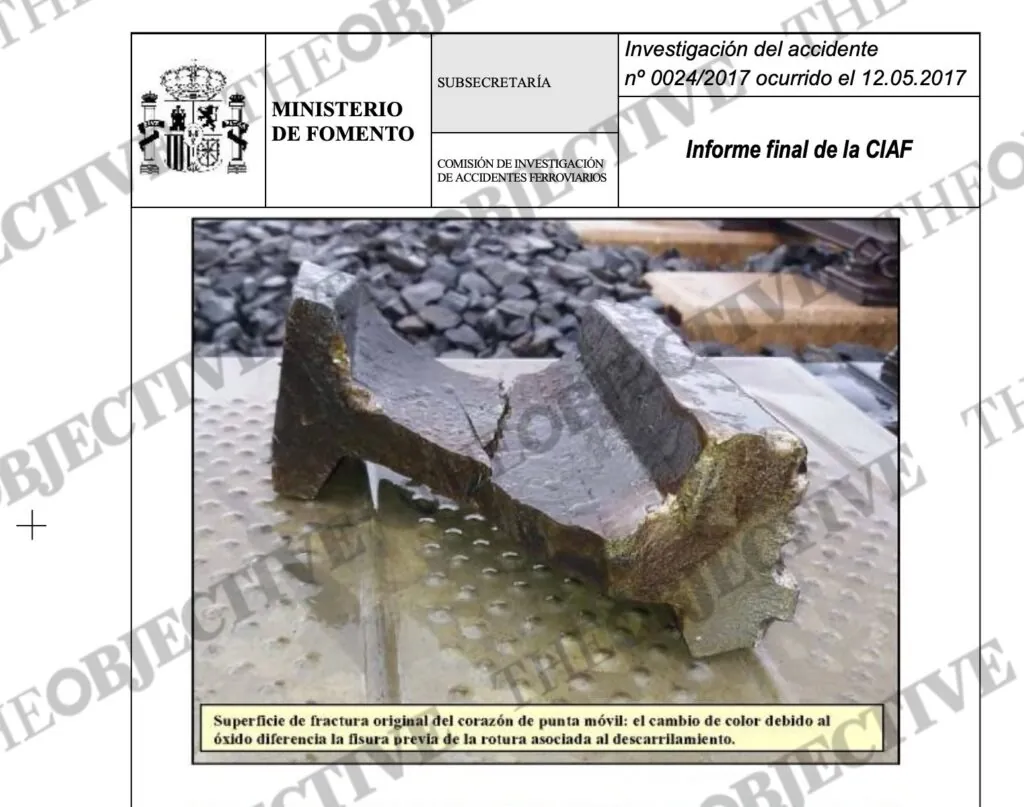 Pero lo que interesa a Transportes de ese informe no son los pormenores del descarrilamiento, sino el resultado de los análisis periciales del carril roto que lo provocó. Exactamente el punto en el que se encuentra en estos momentos la investigación de la CIAF.