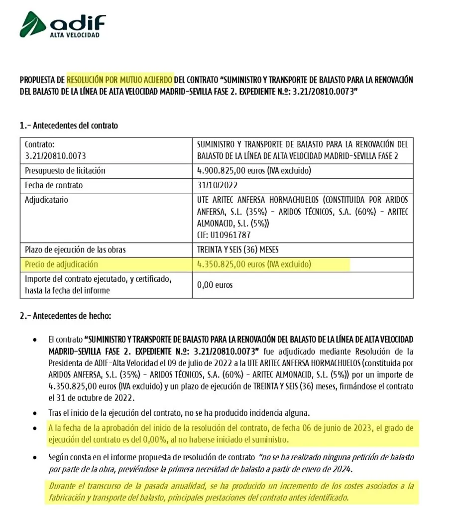 La UTE y ADIF decidieron romperlo «de mutuo acuerdo» el 19 de marzo de 2024. La adjudicación tenía un grado de ejecución del 0% «al no haberse iniciado el suministro». El administrador de infraestructuras ferroviarias explica en la documentación a la que ha tenido acceso THE OBJECTIVE que durante ese periodo «se ha producido un incremento de los costes asociados a la fabricación y transporte del balasto» que impidió cumplir con las condiciones iniciales.