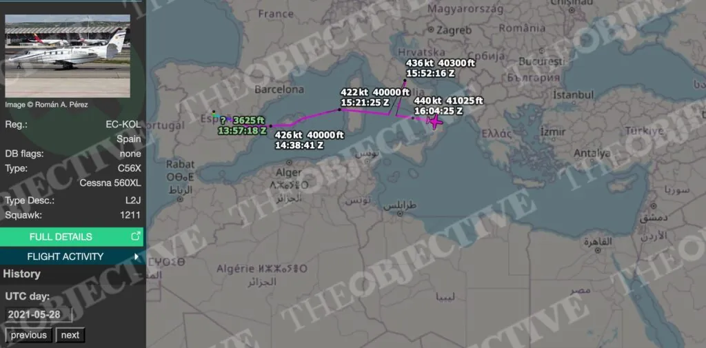 Para volar a Tel Aviv, los representantes españoles recurrieron a esa misma aeronave privada de alquiler, con matrícula EC-KOL, la misma que había volado al menos dos veces a Málaga cuando el equipo de respuesta de NSO Group se encontraba en la ciudad andaluza. Al mediodía del 28 de mayo, casi diez días después de que se produjese el más grave episodio de Pegasus, el jet despegaba del aeródromo de Cuatro Vientos, pista madrileña de uso conjunto civil-militar. Voló con rumbo a Tel Aviv, pero su rastro desaparece a mitad de camino, sobre Italia. Se ‘materializará’ en su ruta de vuelta en ese mismo punto, sobre el mar de Tirreno, cuatro días después.