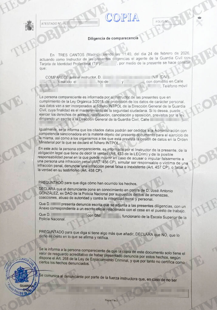 La sombra judicial sobre el que fuera número dos de la Policía Nacional se alarga. La Policía Judicial de la Guardia Civil ya investiga una denuncia presentada por un comisario del Cuerpo Nacional de Policía contra el ex director adjunto operativo (DAO), José Ángel González, conocido dentro del cuerpo como Jota, por presuntos delitos de amenazas, coacciones y abuso de autoridad con afectación a la integridad moral y personal. Según ha podido saber THE OBJECTIVE en exclusiva, el mando policial se personó este martes a las 11:40 horas en la Comandancia de la Guardia Civil de Tres Cantos para formalizar la denuncia. La actuación ha sido asumida por la Policía Judicial del Instituto Armado, que ya ha iniciado las primeras diligencias para esclarecer los hechos relatados por el comisario.