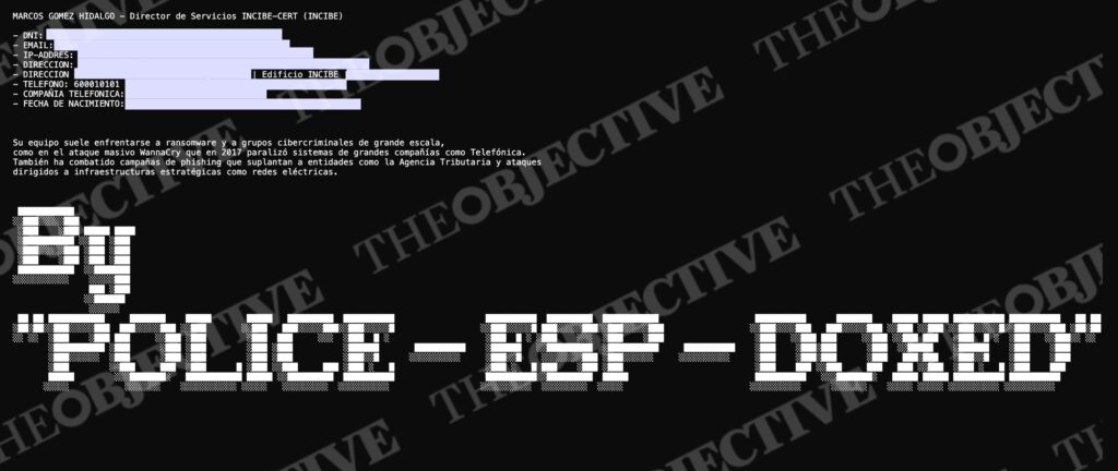 El autor o autores que firman el ataque se hacen llamar ‘Police-ESP-Doxed’. Han ido colgando esta información en los últimos días. La filtración, que THE OBJECTIVE ha podido confirmar en conversación con algunos de los perjudicados, ha afectado a una decena de empleados del Incibe, casi todos con un perfil de gerencia y coordinación de áreas.