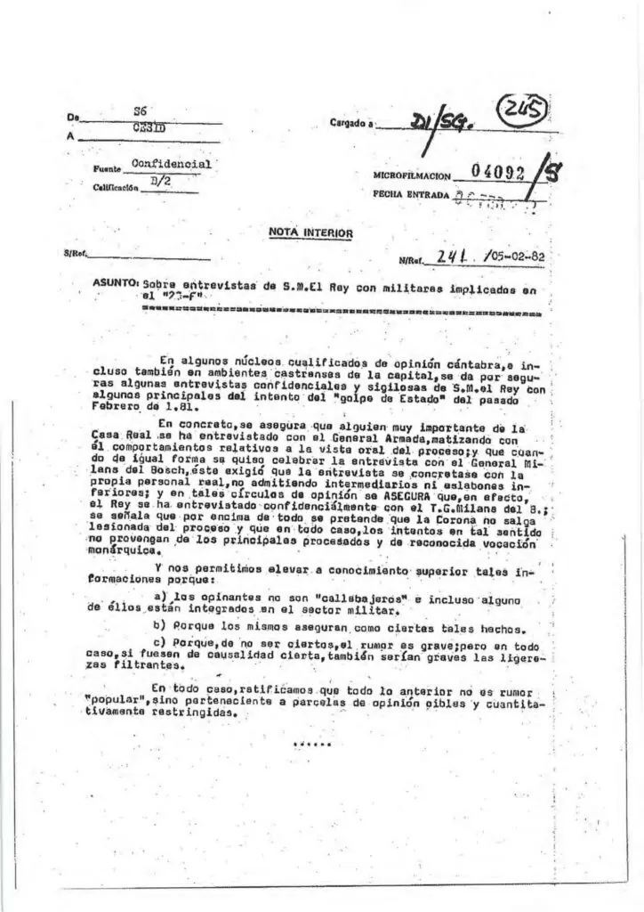 El informe lleva por nombre ‘Sobre entrevistas de SM el Rey con militares implicados en el golpe del 23-F’. En él, los servicios secretos señalan que «en algunos núcleos cualificados de opinión cántabra, e incluso también en ambientes castrenses de la capital, se da por seguras algunas entrevistas confidenciales y sigilosas de S.M el Rey con algunos principales del intento del golpe de Estado del pasado febrero de 1981».