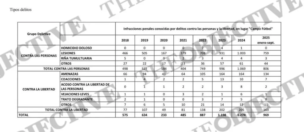 El documento muestra cómo las lesiones prácticamente se han duplicado (de 466 a 759), y aparecen incluso homicidios dolosos desde 2022, algo inédito en los años anteriores. También los delitos contra la libertad se disparan: de 77 en 2018 a 163 en 2025, lo que supone un aumento del 111,7%. Es decir, no solo hay más agresiones físicas, sino también más amenazas, coacciones y conductas intimidatorias en los estadios. El PP considera que «es difícil sostener que las políticas de prevención y control estén funcionando cuando el balance acumulado muestra un deterioro tan evidente».