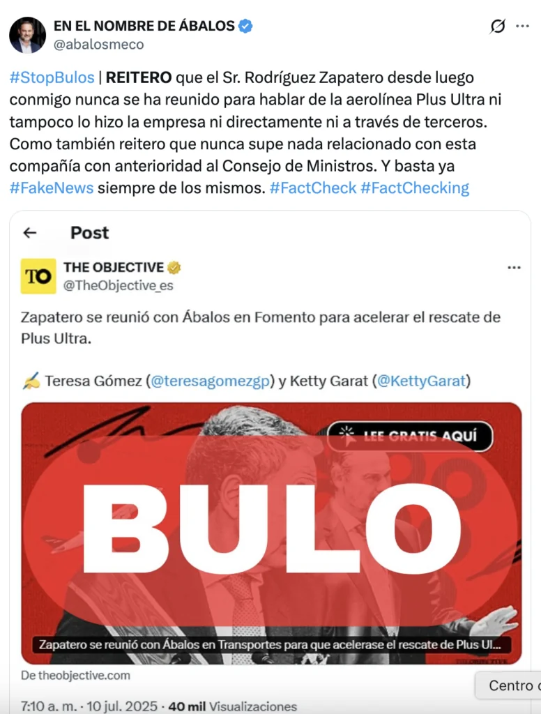 Análisis Relevante, constituida en noviembre de 2019, solo tiene un cliente, Plus Ultra, y dos proveedores, Rodríguez Zapatero y la empresa de sus hijas Laura y Alba. Eso ha llevado al PP a calificarla de «sociedad instrumental». El expresidente del Gobierno se desmarcó en el Senado del rescate citando un tuit de Ábalos en el que calificaba de «bulo» una información de THE OBJECTIVE que aseguraba que se reunió con el exministro de Transportes para acelerar la ayuda pública a favor de la aerolínea.