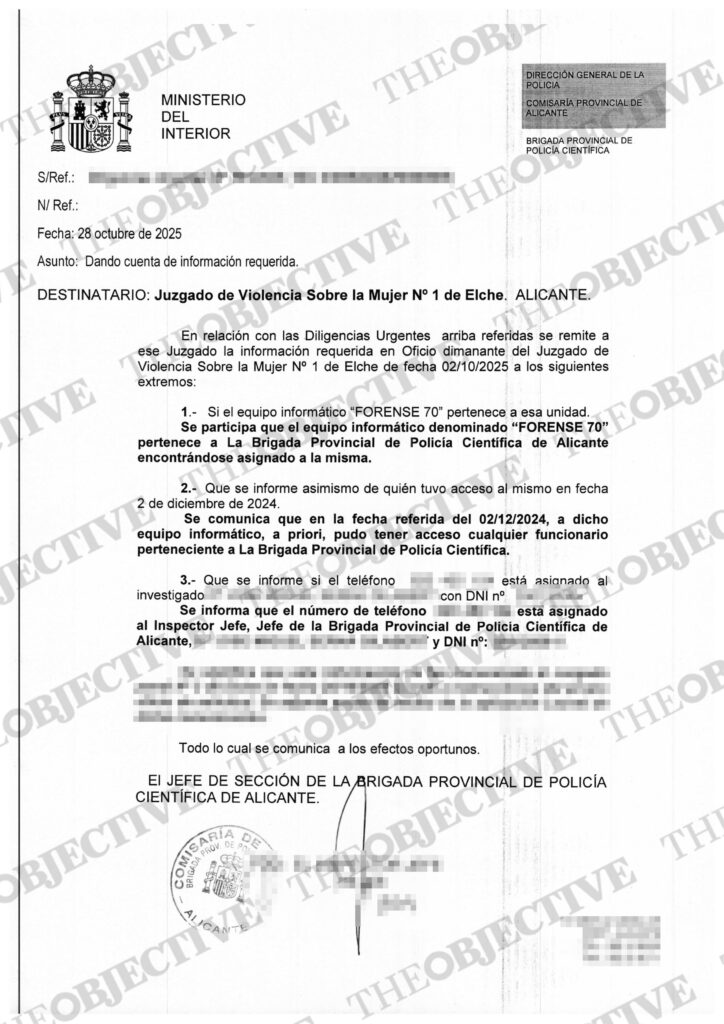 Posteriormente, tras admitir la querella en mayo del pasado, el Juzgado de Violencia sobre la Mujer número 1 de Elche, a cargo de la instrucción, remitió un oficio a la Brigada Provincial de Policía Científica de la Comisaría de Alicante para que diese cuenta de las averiguaciones del citado informe. En un oficio fechado el 28 de octubre de 2025, el departamento policial respondió al juez y confirmó que el equipo informático denominado «Forense 70» pertenecía a la Brigada Provincial de Policía Científica, que se encontraba asignado a la unidad y que uno de los teléfonos que aparecían vinculados al móvil en el informe era del inspector jefe del departamento y exmarido de la denunciante.