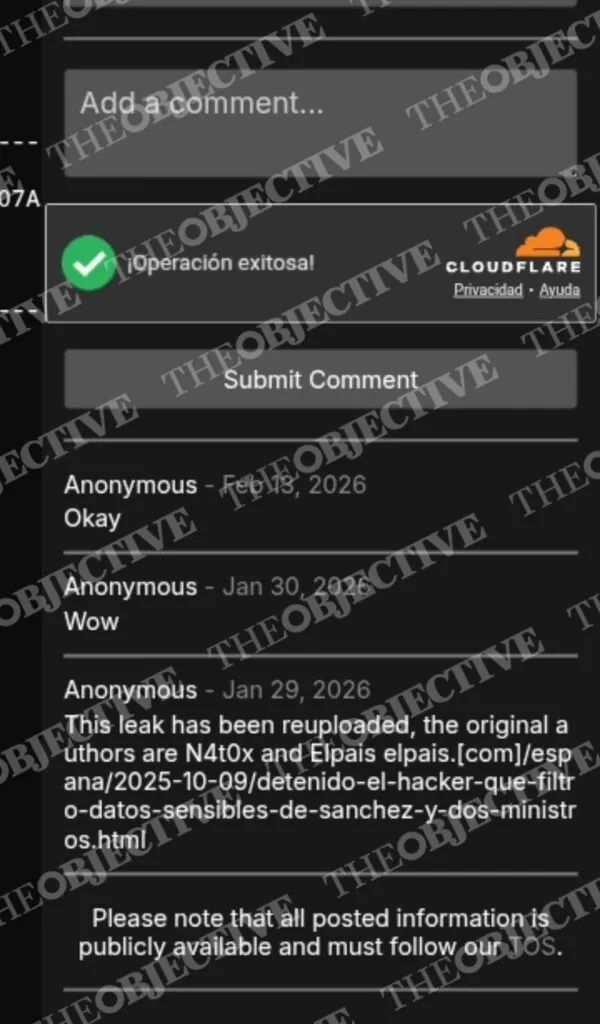 Uno de los comentarios en la página en la que se muestran los datos sensibles ratifica el extremo señalado en esta información respecto a su nueva publicación: «Esta filtración ha sido subida de nuevo; los autores originales son N4t0x».