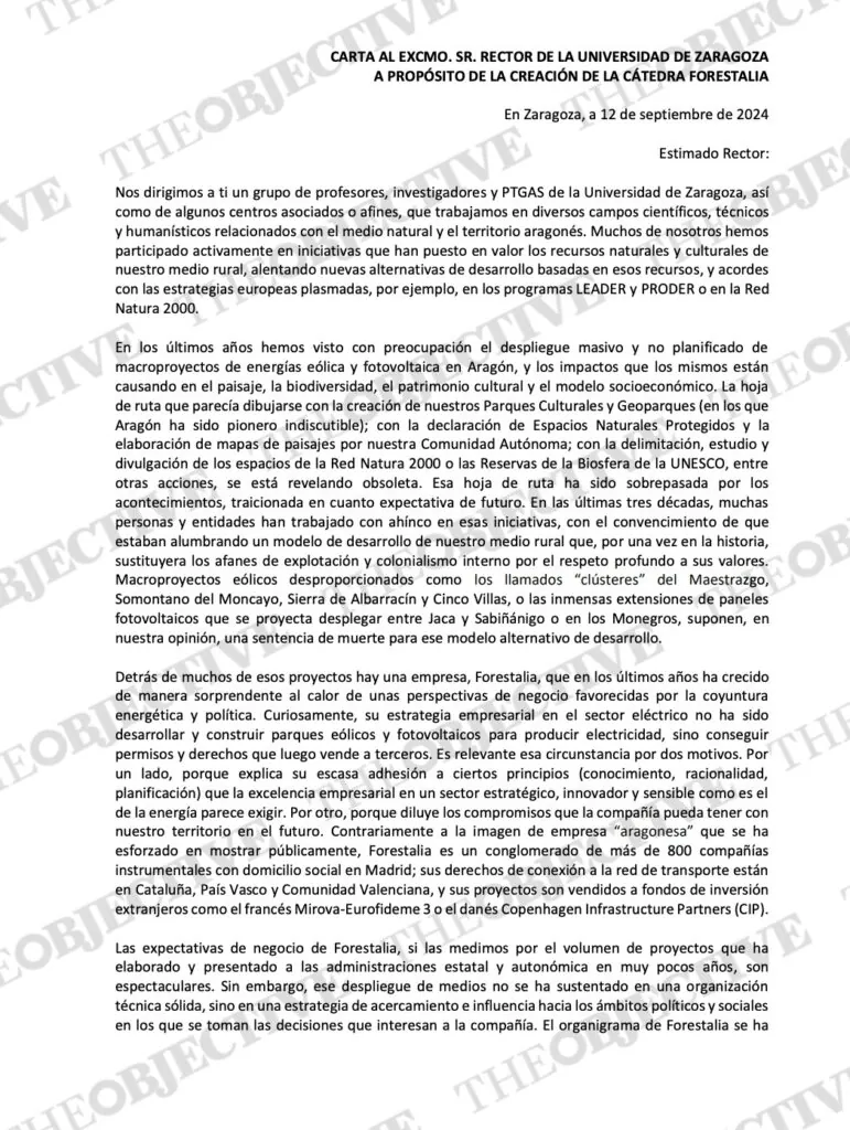 La carta describía con duros términos las presuntas actividades que ahora se achacan en forma de delitos a Forestalia: «Una empresa que ha secuestrado el ámbito de decisión político y administrativo en su beneficio, pretenda secuestrar ahora el ámbito académico para dotarse de una imagen de rigor y respetabilidad, no es, en nuestra opinión, admisible».
