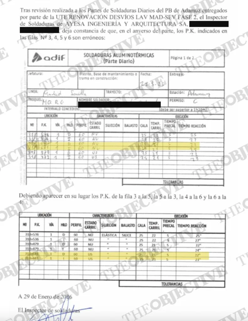 La empresa que supervisó la soldadura del carril roto en Adamuz emitió el pasado 29 de enero un documento de dos páginas en el que modificaba sustancialmente el parte de esa actuación. El cambio, explicaba el inspector de soldaduras E.J.H.R. de la empresa Ayesa Ingeniería y Arquitectura, se originó en un «error» cometido por el técnico soldador que realizó la unión del carril viejo con el carril nuevo en el punto en el que se rompió la vía la noche anterior al siniestro, tal y como ha desvelado THE OBJECTIVE en exclusiva.