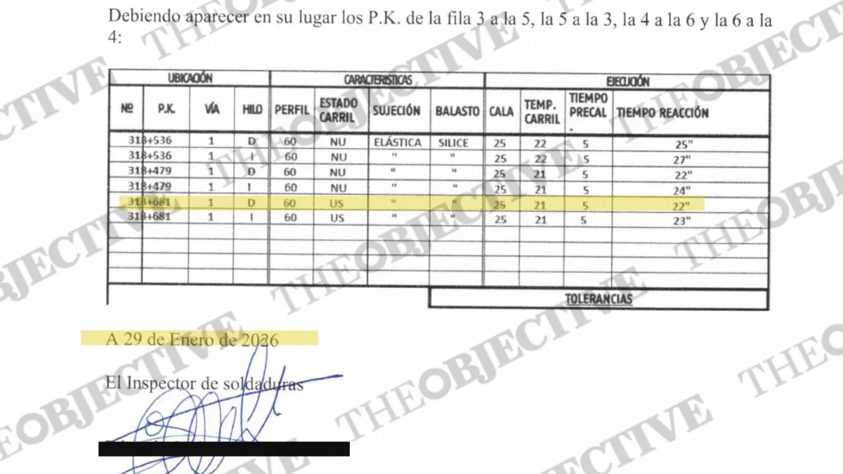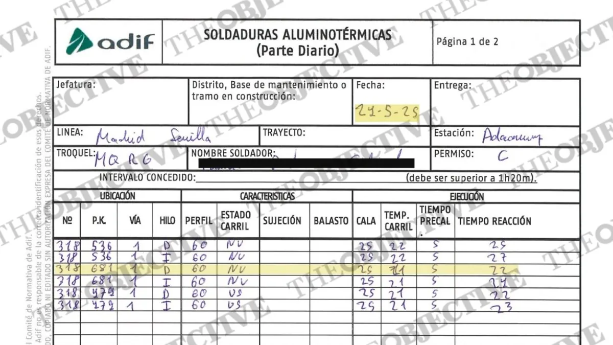 La empresa que supervisó la soldadura del carril roto en Adamuz emitió el pasado 29 de enero un documento de dos páginas en el que modificaba sustancialmente el parte de esa actuación. El cambio, explicaba el inspector de soldaduras E.J.H.R. de la empresa Ayesa Ingeniería y Arquitectura, se originó en un «error» cometido por el técnico soldador que realizó la unión del carril viejo con el carril nuevo en el punto en el que se rompió la vía la noche anterior al siniestro, tal y como ha desvelado THE OBJECTIVE en exclusiva.