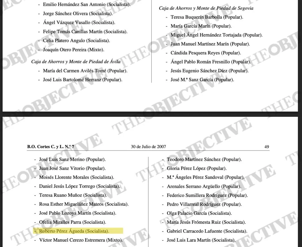 La relación de este abogado con círculos del PSOE se remonta, al menos, a 2007. En julio de ese año, el Pleno de las Cortes de Castilla y León aprobó la designación de los consejeros generales de las cajas de ahorro de la comunidad autónoma. Roberto Pérez Águeda figura en la lista como consejero general de Caja de Ahorros y Monte de Piedad de Segovia (bajo el nombre comercial de Caja Segovia). Entre paréntesis, «socialista», en referencia al grupo parlamentario de las Cortes que le propuso para el cargo.