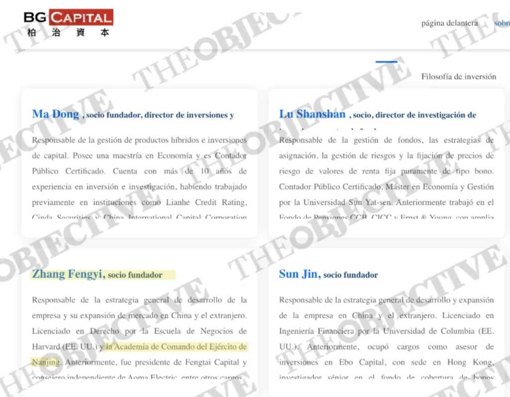 La biografía que Feng Yi Zhang ofrece en la web del Gate Center —el lobby prochino encabezado por el expresidente del Gobierno José Luis Rodríguez Zapatero— no recoge un episodio relevante de su trayectoria: su paso por la Academia de Comando del Ejército Popular de Liberación (EPL) de China, ubicada en Nanjing. La omisión resulta llamativa porque ese mismo antecedente sí figura en su perfil —publicado en chino— como socio fundador de BG Capital, tal y como ha podido acreditar THE OBJECTIVE. Se trata de uno de los fondos de inversión con los que ha estado vinculado en China, donde la formación aparece mencionada junto a su titulación por la Escuela de Negocios de Harvard. En la versión que presenta en España, solo se recoge Harvard.